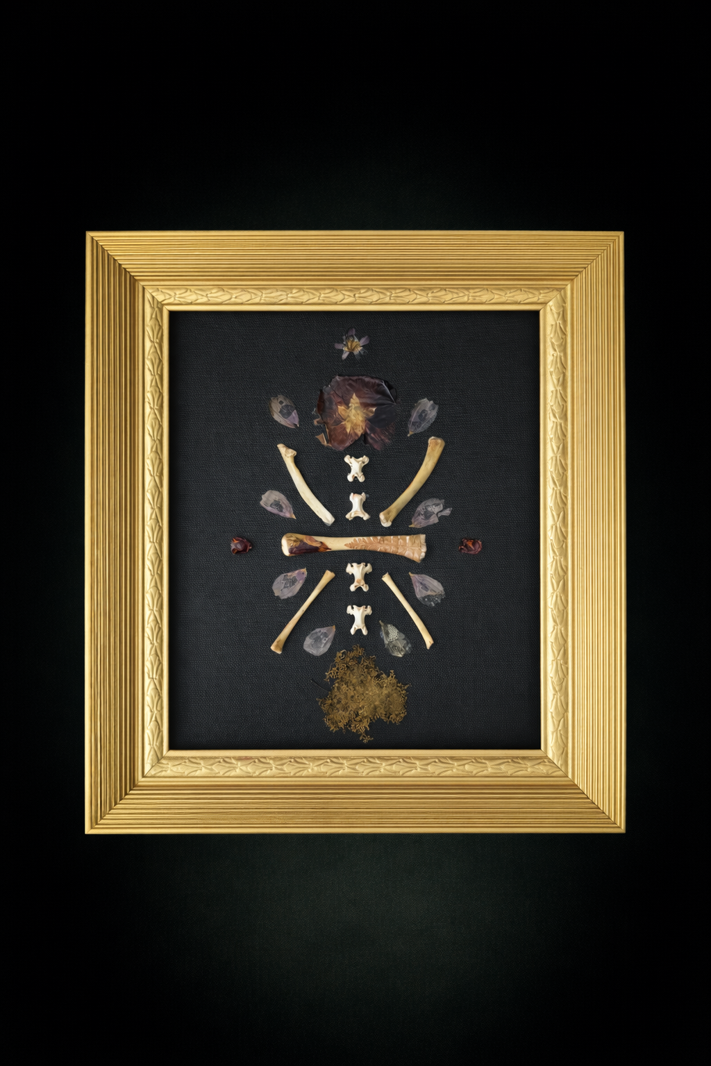 Symmetrical display of flower, moss, and bone with pressed petals and fern in 8 x 10 in hand-painted gold frame.